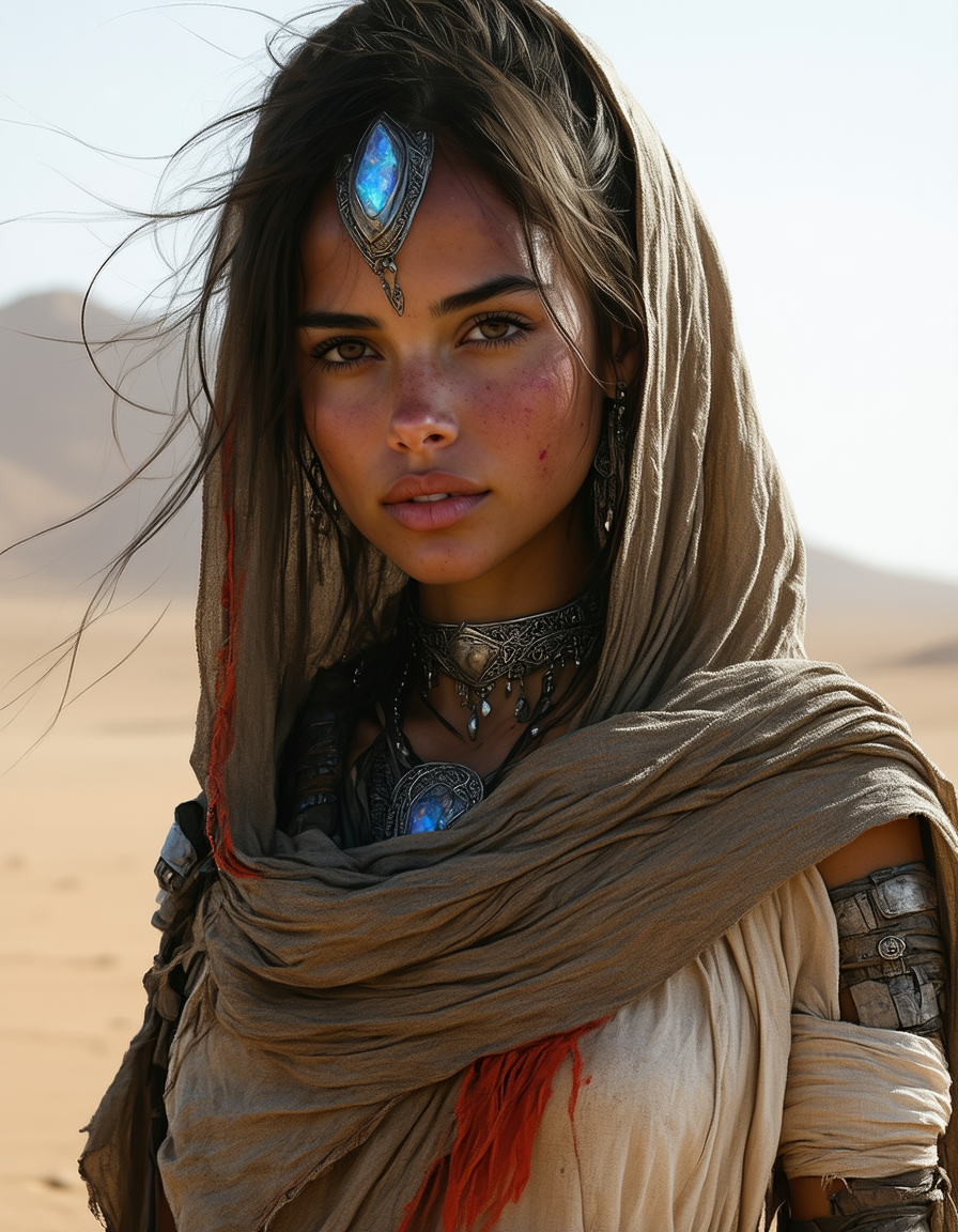 Photorealistic depiction of a beautiful, indian female cybernetic Tech-Nomad in a Post-Apocalyptic Desert, Include fingerless gloves with tiny crystals embedded along the seams, catching the light and adding a touch of sparkle to her outfit. Include a choker with intricate beadwork and a central gemstone that glows softly, drawing attention to her neckline and face.a layered shawl with intricate fractal edges, draped over her shoulders and moving gently with her, adding depth to her outfit. Subtle dirt on her face