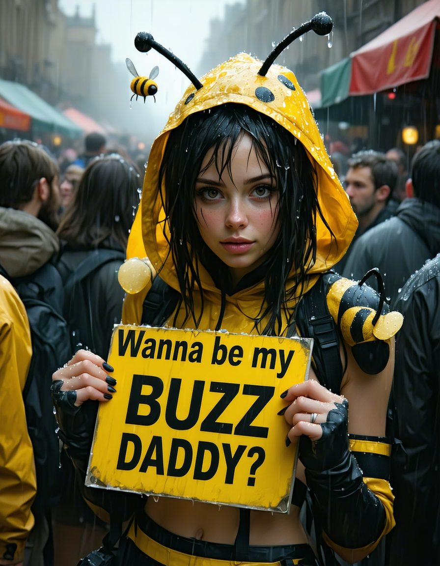 Extreme realistic depiction of a Wet Beauty holding a 'Wanna be my BUZZ DADDY?' billboard among a busy crowd.'BUZZ DADDY?" written in bold letters.She is wearing a Honeybee costume, shot with 50mm lens, f/2.8 for deep focus.extremely wet, realistic wet skin texture, realistic wet clothing heavy rain, realistic fabric texture,Show a few wet hair flyaways around her face, catching the light and adding a natural, slightly messy look.detailed iris patterns in her eyes, with subtle color variations and a bright highlight,