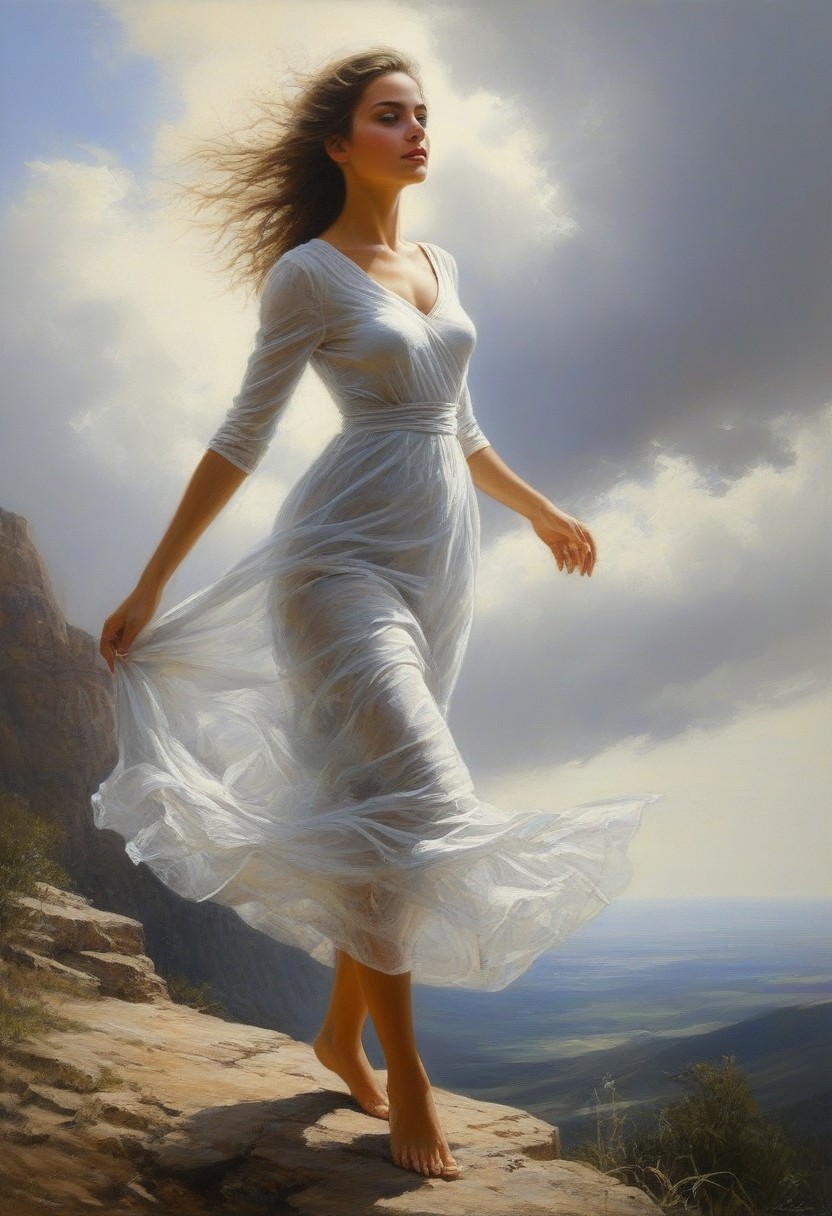 Work of art, hyper realistic-surreal and fantastical composition, peaceful, serene, imaginary and peaceful landscape, dynamic pose, breathtaking fusion, multi-layered, finely artistic works, style by Michael Garmash/ Luis Royo/Wadim Kashin/Greg Rutkowsky. Portrait of a girl, very beautiful girl, full body, a painting of a woman Charming pencil sketches by Albert Eckhout, in full color In this fascinating acrylic painting you can see a charming woman. The dress is very elegant and very well made. This stunning image captures the viewer's attention with its vibrant tones and dreamlike atmosphere. The expertly crafted brush strokes and intricate details show the artist's skill, making the image truly captivating. Through vivid colors and meticulous execution, the painting showcases the artist's ability to create a stunning and visually striking depiction.