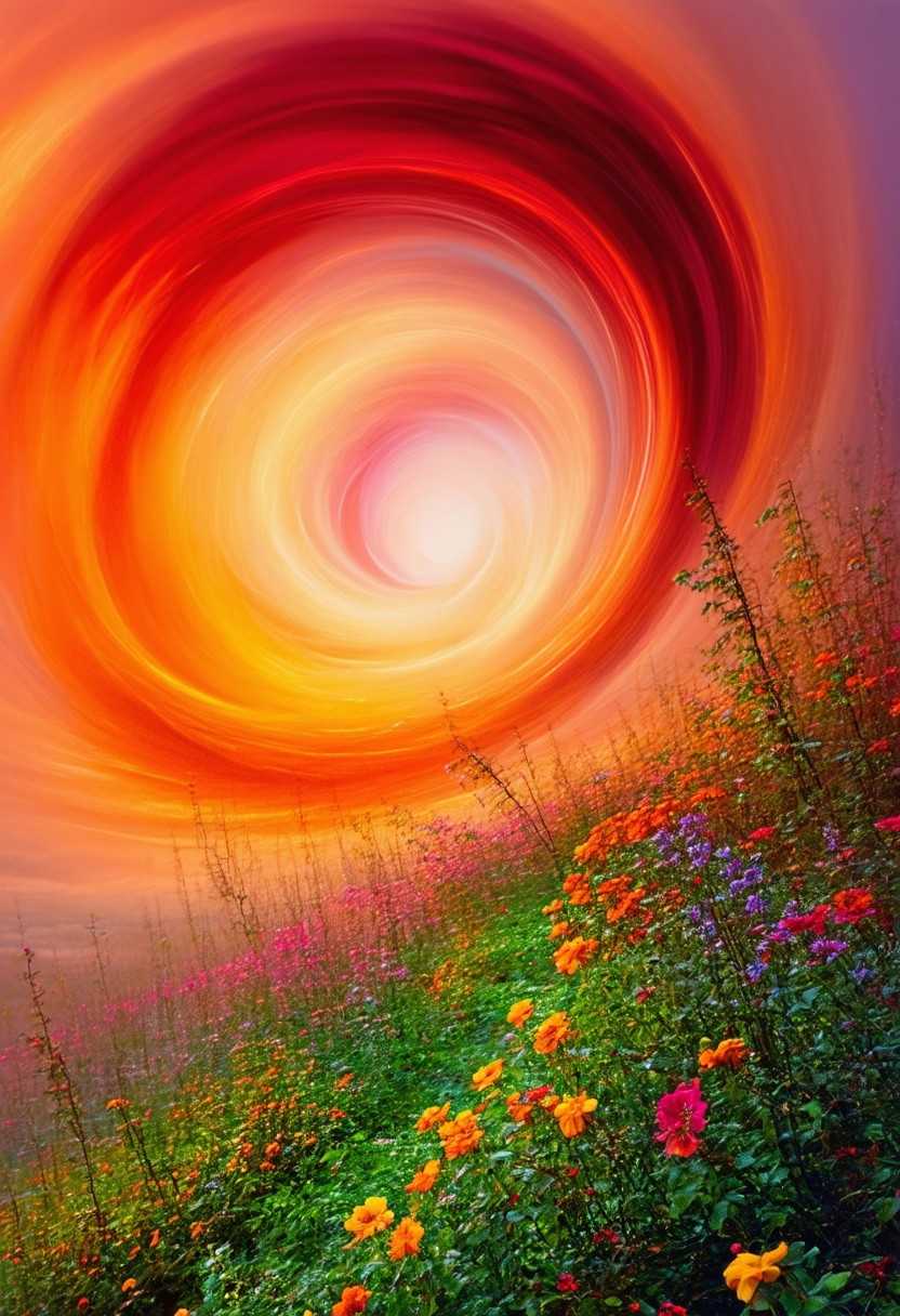 RAW photo, landscape of a In a surreal landscape, a swirling vortex of colors fills the air. The sky is painted in shades of orange and red, casting intricate shadows on the ground below. A lush garden with colorful flowers and vines blooms in full swing, Stormy weather, Intentional Camera Movement, Cinestill 50, F/5, Colorful, art by Waterhouse, John Constable, Ed Blinkey, Atey Ghailan, Studio Ghibli, Jeremy Mann, Greg Manchess, Antonio Moro and makoto shinkai