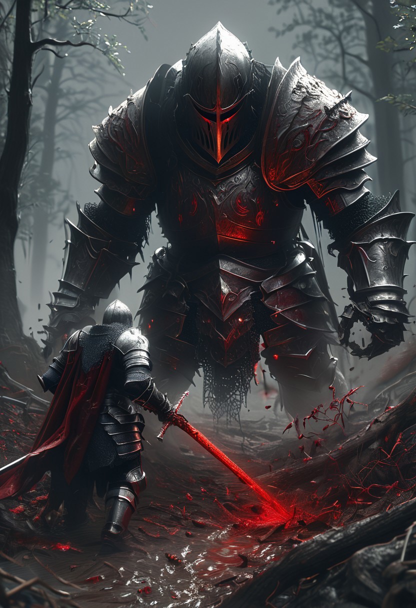 The Blood Knight of Ashen Hollow: In a cursed forest where the trees bleed and the ground is soaked in crimson, the hero faces a vampiric knight, clad in dark armor. With every hit, the knight regenerates by siphoning the blood from the earth itself. The hero, a holy cleric, must cleanse the battlefield with divine light while dodging the knight’s swift, deadly strikes in a fight where darkness and light clash, Bosstyle<lora:CyberRealistic_Negative-neg:1> <lora:detailed_notrigger:1> <lora:XL_boss_battle:1>