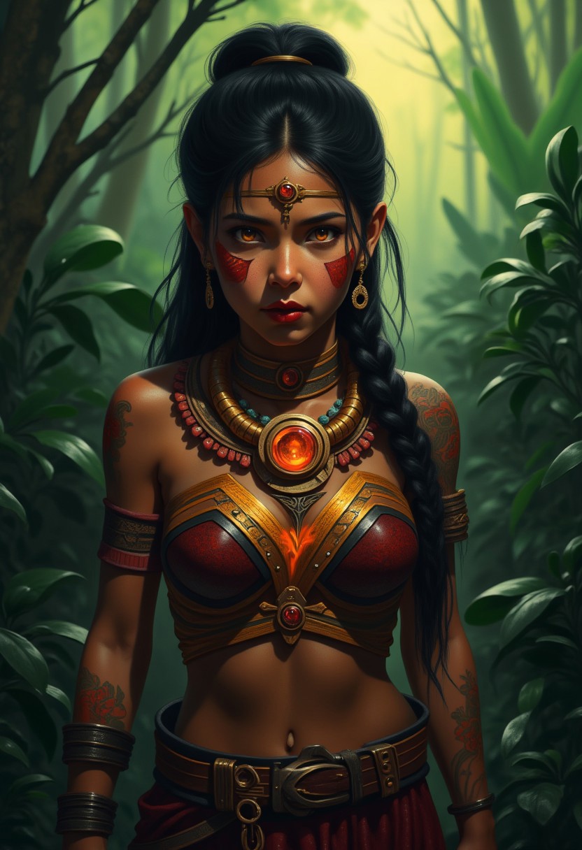 Aztec girl warrior, upper body character design, full body heavily tattoo with glowing Aztec symbols, incredible beautiful, intricated details, ornate, dark fantasy, magical style, low-angle shot, hazel-eyes, detailed eyes, creeping through dense jungle, light rays on face