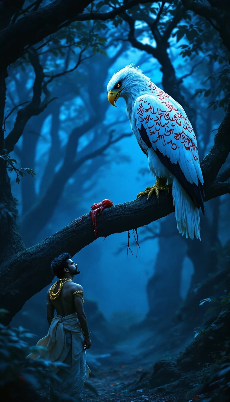 "In a mystical, cool-toned forest, a white eagle about half the size of Arjun is perched on a tree branch. Its feathers are subtly adorned with intricate red Vedic script, blending seamlessly into its plumage. The eagle is calm and composed as it eats a piece of meat, adding an unsettling irony to the scene. A short distance away, Arjun stands on the ground, dressed in a traditional dhoti with gold ornaments on his upper body, symbolizing his royal heritage. He watches the eagle with a visible look of discomfort and inner conflict. The entire scene is bathed in atmospheric, cool lighting that enhances the mystical quality of the forest, creating a contrast between Arjun’s disturbed expression and the eagle’s serene demeanor."