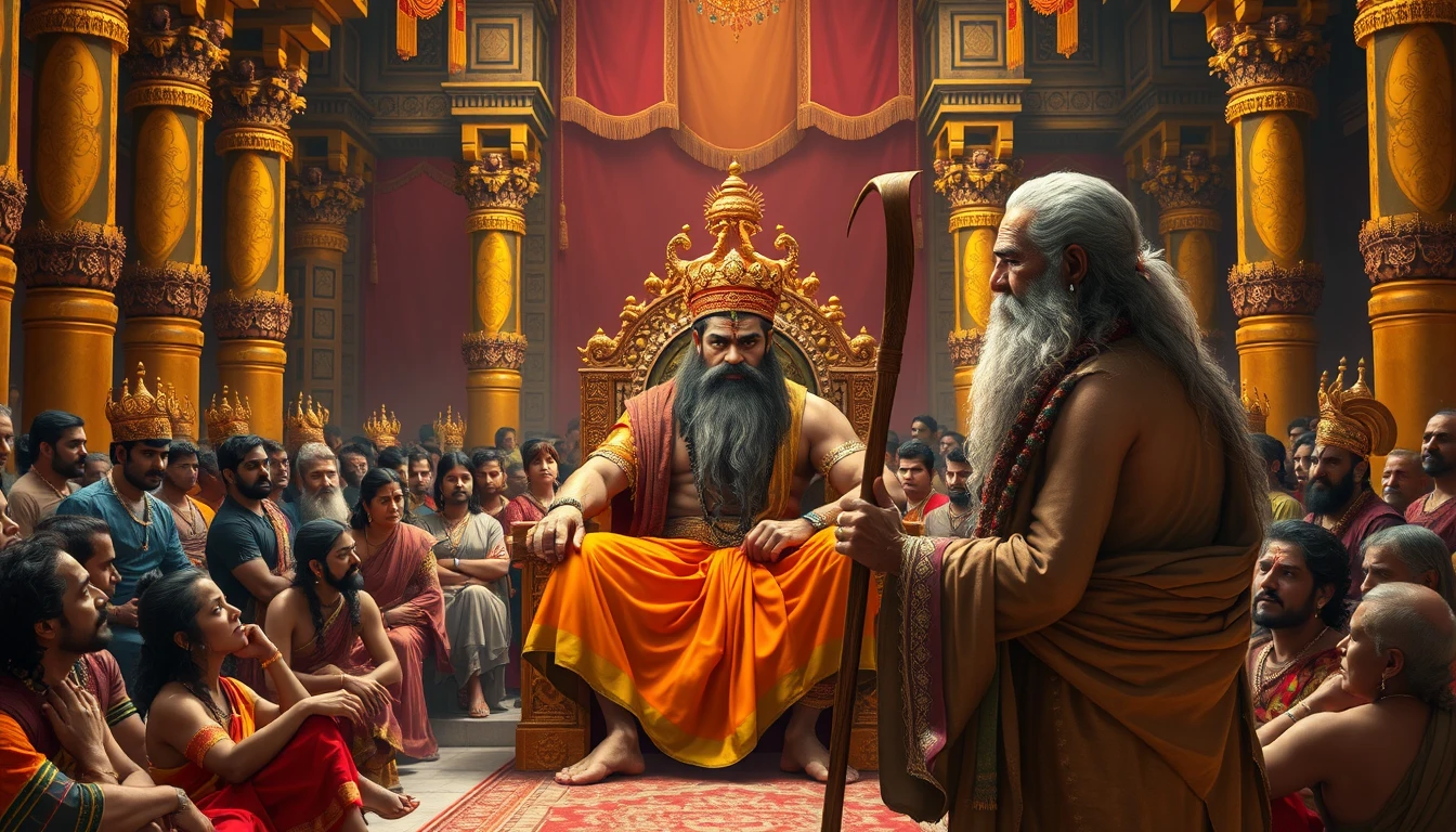 A grand royal court, lavishly decorated with golden columns and hanging tapestries, filled with courtiers dressed in elaborate, colorful attire, all focused intently on the scene before them. At the center, King Harishchandra sits calmly on a magnificent throne, exuding strength and authority. He is a muscular warrior king with a thick, long beard and an intense, wise gaze. Dressed in a royal orange dhoti with gold trim, a golden crown adorned with intricate designs, and layered necklaces, he embodies regal dignity and calmness. In front of him stands Sage Vishwamitra, an elderly man with a dignified presence, his long beard and hair framing a weathered, thoughtful face. Clad in simple, earthy-toned robes that highlight his ascetic life, he holds a wooden staff, his serious expression softened only slightly by a spark of determination in his eyes as he faces the king. The atmosphere is tense as the courtiers watch this solemn exchange, the opulent hall bathed in warm light, adding gravity to the unfolding moment.