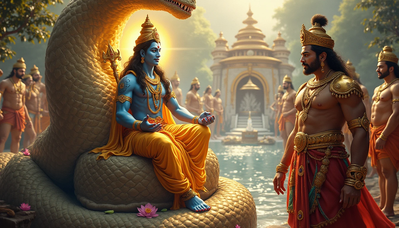 “An ultra-realistic depiction of Lord Vishnu in Vaikuntha Puri, explaining the concept of Samudra Manthan to King Indra and other gods. Lord Vishnu, with a radiant blue complexion, wearing golden silk robes and intricate celestial jewelry, sits serenely on the cosmic serpent Sheshnaag with its thousand-hooded canopy. His four arms hold a conch, discus, mace, and lotus, radiating divine authority, surrounded by a glowing golden aura. King Indra, standing tall with a golden complexion, regal golden armor, a shimmering royal blue and gold dhoti, a flowing red cape, and a gem-encrusted crown, listens intently alongside other gods adorned in celestial attire. The setting is the ethereal Vaikuntha Puri, with its lush green gardens, vibrant celestial flowers, shimmering golden pathways, crystal-clear rivers, and the magnificent central palace glowing with divine light. The atmosphere is illuminated by a warm, celestial glow, filled with divine energy and harmony, capturing the grandeur of this mythological moment.”