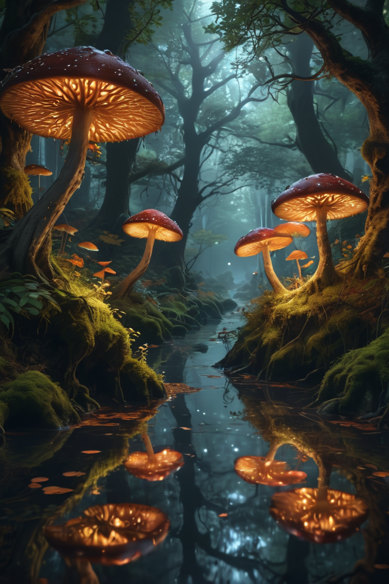 A mystical, enchanted forest, where the trees have twisted, intertwining branches and leaves that shimmer with magic. The forest is filled with strange, glowing creatures and glowing mushrooms, and a sparkling river runs through the center, its waters filled with glittering fish. 8K