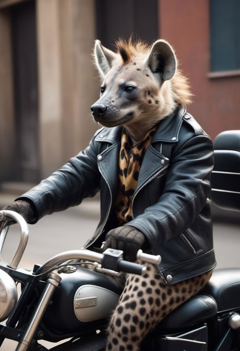 anthropomorphic furry spotted hyena, tall, thick toned and thickly furred, with dark gloved paws, greaser 50's style, reclining on a motorcycle