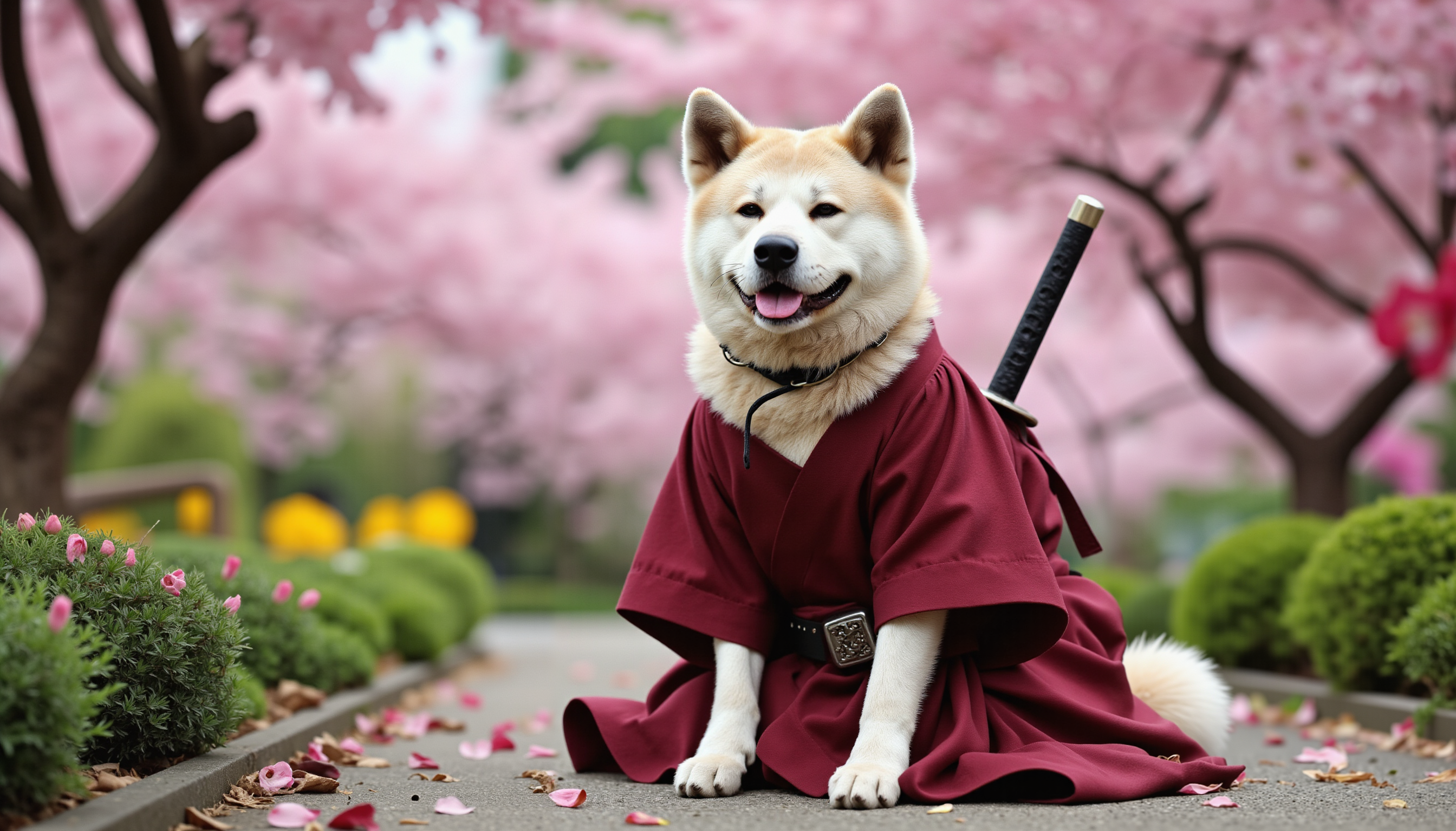 yujin akita inu dog sitting dressed as samurai with dark red kimono holding a katana sword, in a japanese garden under blooming sakura treesind with sakura petals