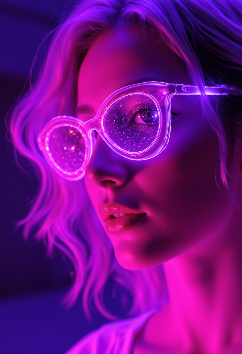 Neon-lit close-up, A hyper-realistic close-up of a beauty supermodel sexy girl face with fire flame, big lips, bathed in neon pink and purple light with glittering particles on her skin, neon sunglasses with glitter textures patterns, fashion magazine style, beautiful background, Use soft colors and a shallow depth of field