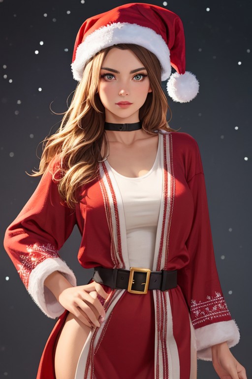 ((masterpiece:1.2, top quality, 8K),hires textures, high details), realistic, volumetric lighting, american, (solo female, Christmas wife),sfx effect, striking eyes,(detailed eyes), detailed body,playful personality,elegant, unique accessories, (skintight Christmas robe, Christmas hat), large hip, fit torso, (Christmas background), detailed hair