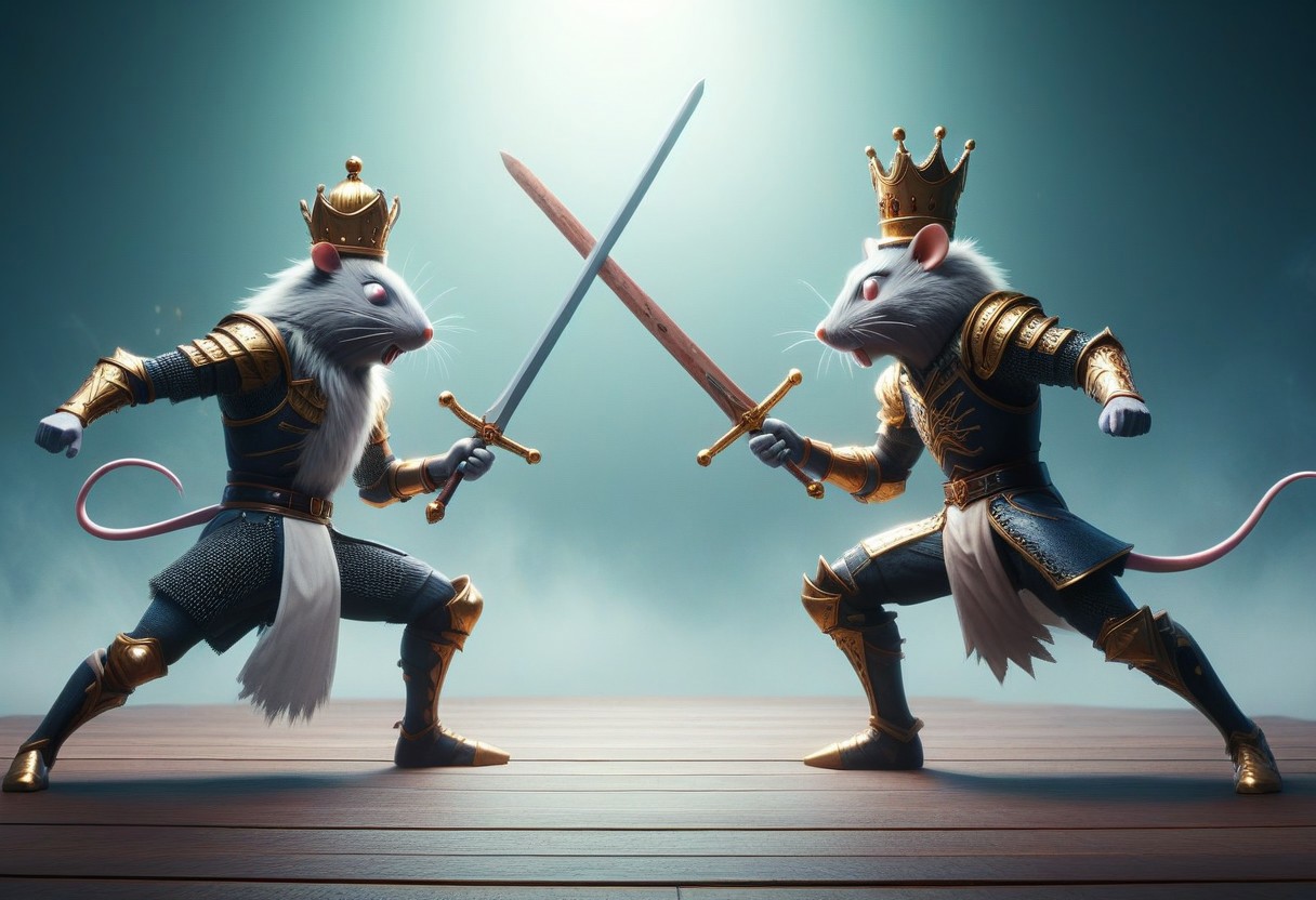 human wooden nutcracker, rat king fighting each other, 1vs1, anime style, sword duel
