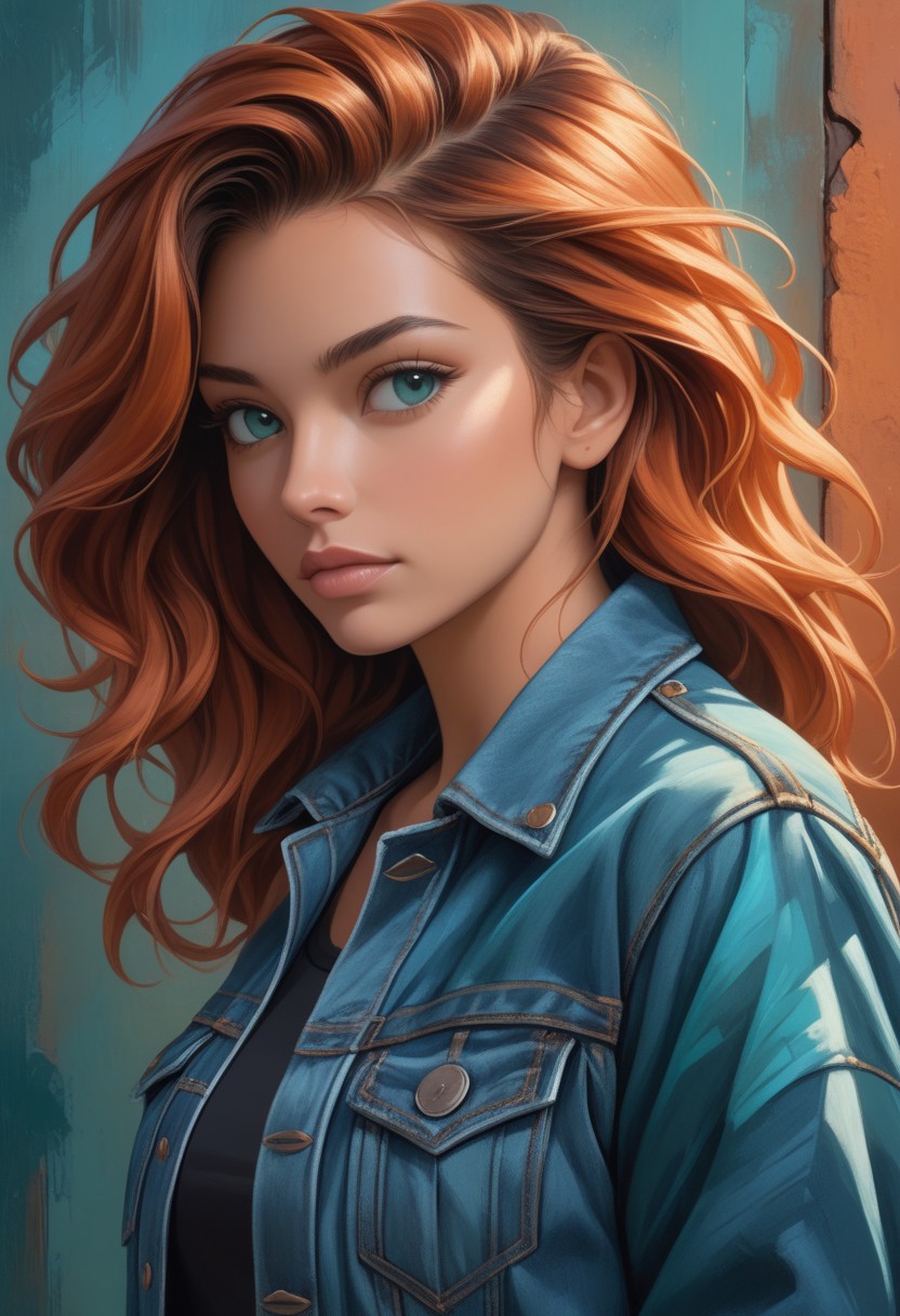 Bold acrylic painting, warm terracotta and cool teal, hyperrealistic fantasy art depicting a person in a denim jacket, dramatic lighting, detailed textures, vibrant colors, textured brushstrokes. Photorealistic, earthy and cool contrast, cinematic atmosphere.