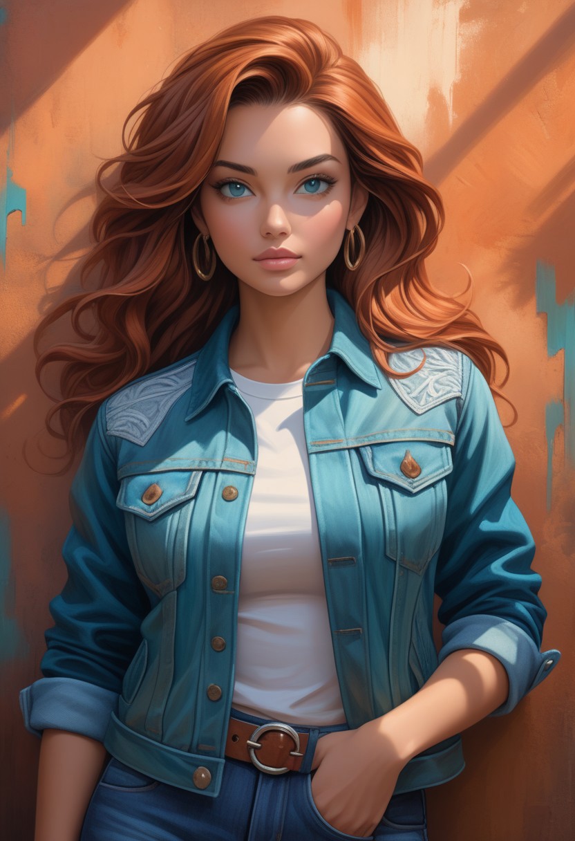 Bold acrylic painting, warm terracotta and cool teal, hyperrealistic fantasy art depicting a person in a denim jacket, dramatic lighting, detailed textures, vibrant colors, textured brushstrokes. Photorealistic, earthy and cool contrast, cinematic atmosphere.