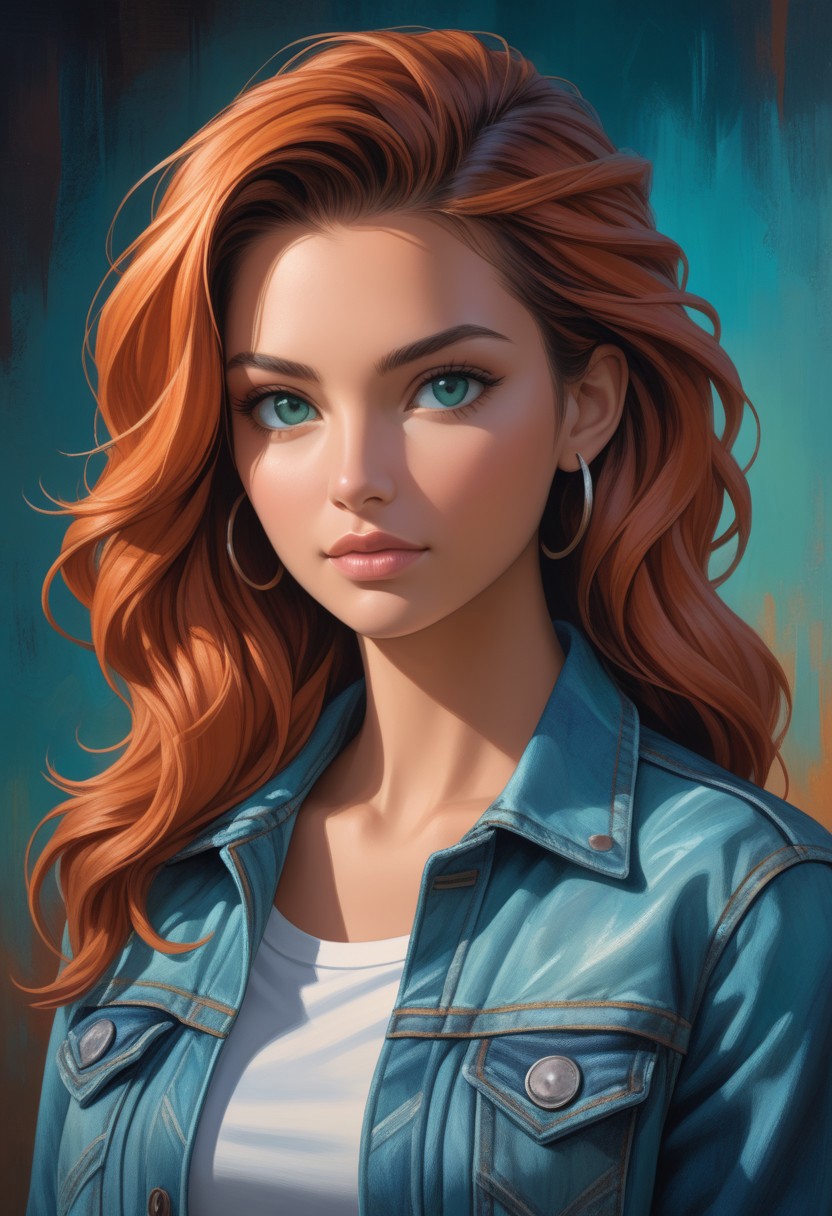 Bold acrylic painting, warm terracotta and cool teal, hyperrealistic fantasy art depicting a person in a denim jacket, dramatic lighting, detailed textures, vibrant colors, textured brushstrokes. Photorealistic, earthy and cool contrast, cinematic atmosphere.