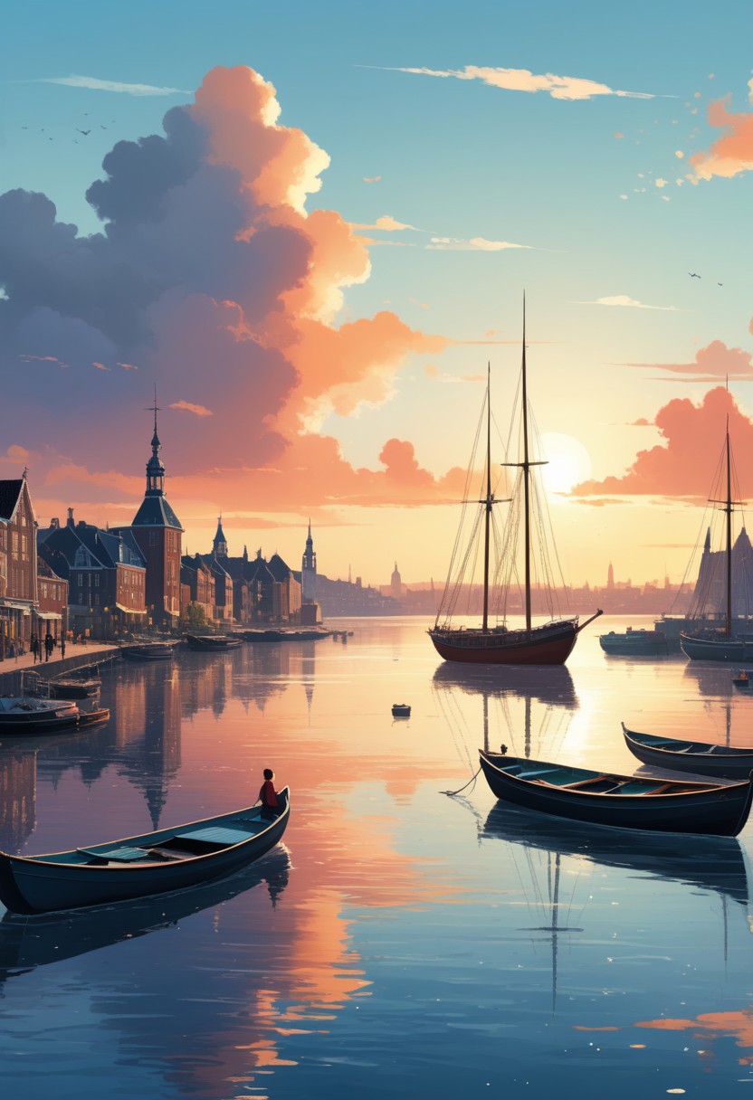 Symbolic traditional tattoo art print, ethereal spiritual vibe, boat on water at summer's end, hyperrealistic cityscape, Dutch landscape, dramatic skies, digital painting, majestic ports, Pascal Campion style, light aura, mystical feeling, vibrant colors, retro flair, complex ornament, white background.
