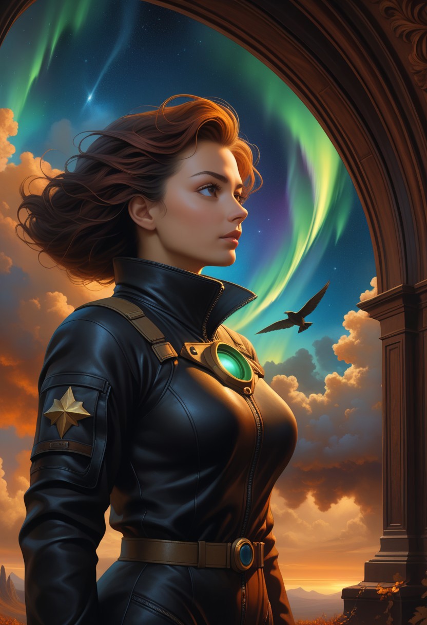 Eerie, creepy atmosphere, warm autumn colors. Tleilaxu-inspired portrait, head and chest in flight suit. Mysterious glowing portal. Cinematic sci-fi scene, aurora, clouds, stars, smoke. Dark tones, unsettling details, earthy and cozy feel. Beksinski, Spitzweg, Caravaggio influences. Baroque elements. Oil on canvas, 8k, dramatic, trending on ArtStation.