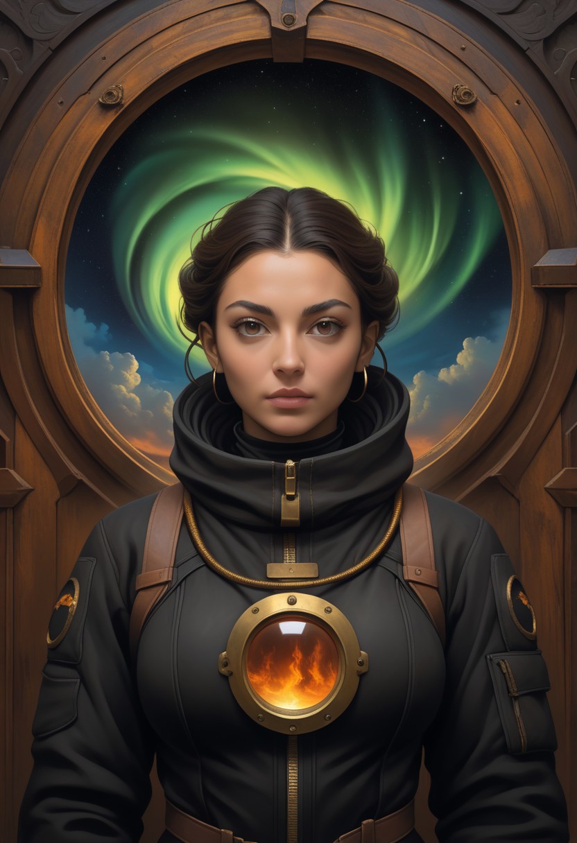 Eerie, creepy atmosphere, warm autumn colors. Tleilaxu-inspired portrait, head and chest in flight suit. Mysterious glowing portal. Cinematic sci-fi scene, aurora, clouds, stars, smoke. Dark tones, unsettling details, earthy and cozy feel. Beksinski, Spitzweg, Caravaggio influences. Baroque elements. Oil on canvas, 8k, dramatic, trending on ArtStation.