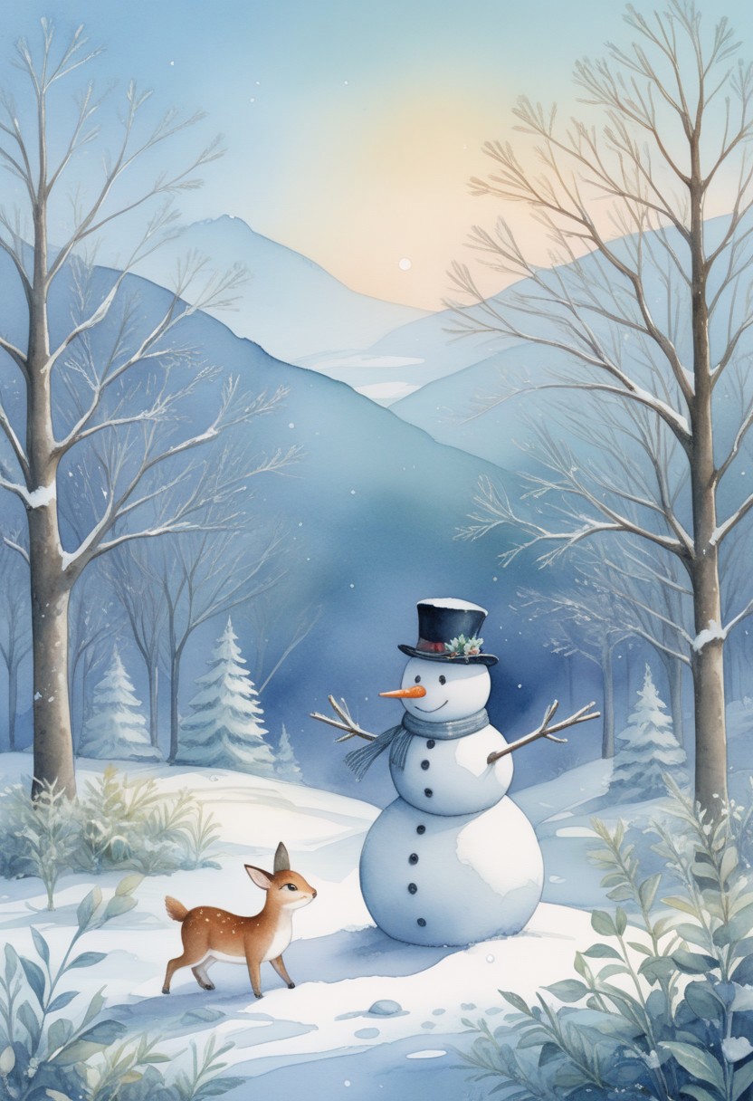 snowflake, fristy the snowman, whimsical illustrations, soft watercolor tones, detailed natural settings, charming animal characters, delicate linework, pastoral landscapes, gentle storytelling, Victorian aesthetic, childlike innocence, warm and inviting, flora and fauna details, timeless and nostalgic, tender and imaginative, classic children's book style
