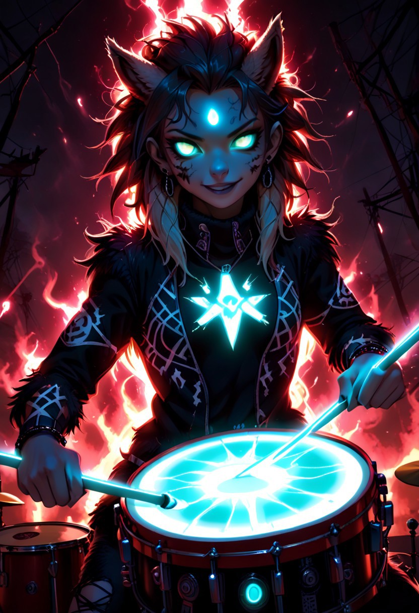 from below, detailed face, 1girl, anthro alpaca girl. punk rocker girl, playing on drums, evil smirk. glowing plasma contur , shiny eyes, outdoors, dim light, lightings, shadows, toned colors, , horror theme, ,detailed background.