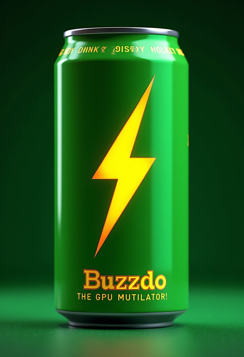 A photo ad of an energy drink in a green can. On the can there is a yellow 3d rendered lightning bolt. The drink is called "Buzzzdo". The subtitle under the can reads in italics and all caps "The GPU Mutilator!"