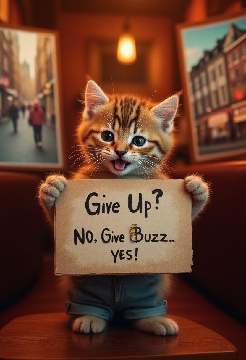 A very cute adorable charmingly down-to-earth kitten with a warm smile is seen in a lively bar, holding up a sign that reads "Give Up? No Give BUZZ? Yes!'' The kitten is dressed casually, with a relaxed demeanour that invites connection. The images on either side of him are striking photographs, capturing vibrant city scenes with a touch of nostalgia. Each image is richly detailed, showcasing a blend of modern urban life and old-world charm. The overall composition exudes a sense of warmth and familiarity, making it impossible to look away.