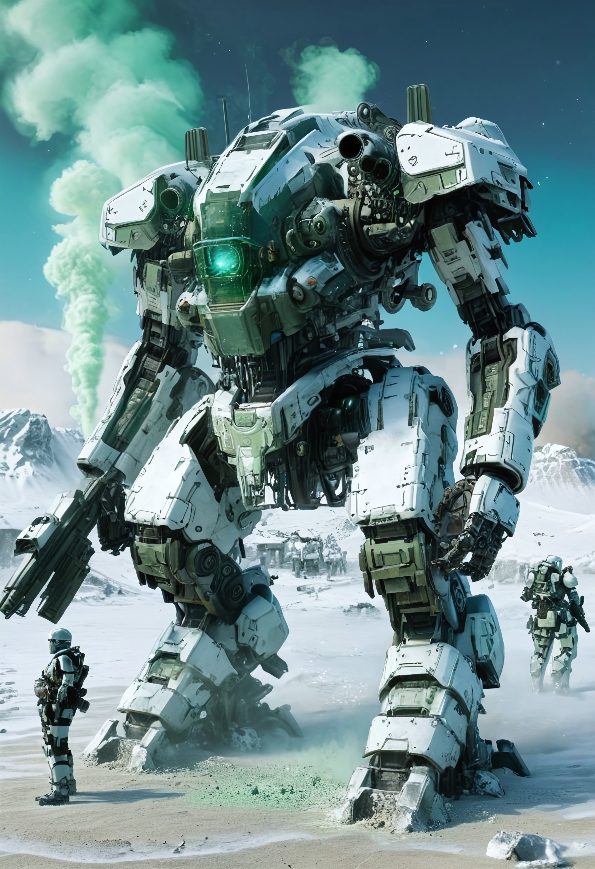 snowy mountain, higly detailed, white, shiny, mecha, standing in front of a battlefield surrounded by translucent cyborgs, explosions in the background, stars in background, green smoke, cyan sand everywhere, easynegative, ng_deepnegative_v1_75t