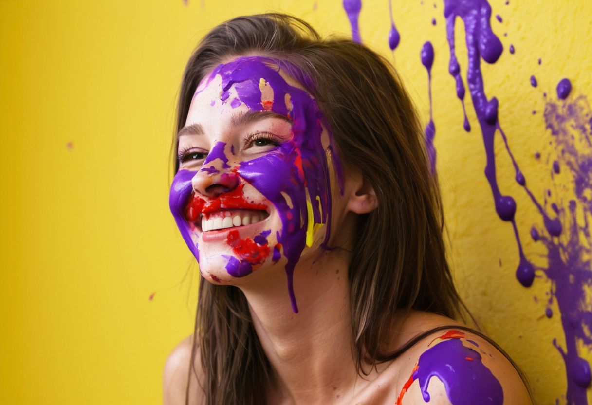 female model smiles turning her head right while still looking at the camera, subject offset left. rest of frame is filled with purple paint explosions on yellow wall