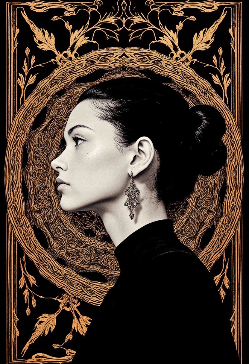 A surreal, abstract digital artwork presents a minimalist yet striking depiction of a woman with a white complexion, her serene expression radiating calm elegance. She wears a simple black top, her hair styled in a neat bun, and large, intricate silver earrings that add sophistication. Positioned in profile, facing to the right, she is framed by a symmetrical, ornate mandala-like background in opulent shades of gold and black, forming a mesmerizing geometric design. The intricate pattern centers around her figure, partially obscuring her face to evoke an air of mystery and intrigue. The stark contrast between her pale skin and the dark, elaborate background accentuates the composition's depth and balance. The background’s repeating motifs introduce a sense of complexity, while her understated outfit ensures her poised presence remains the focal point. Smooth gradients and razor-sharp details create a polished, professional finish, with a sleek black border framing the image for added refinement. Her graceful pose and introspective demeanor harmonize with the intricate backdrop, merging human form and abstract design seamlessly. This artwork embodies a contemporary aesthetic, balancing simplicity with intricate sophistication to convey elegance and depth. It stands as a visually captivating and thought-provoking piece, celebrating the interplay between humanity and abstraction, rendered with timeless innovation and modern artistic sensibilities.