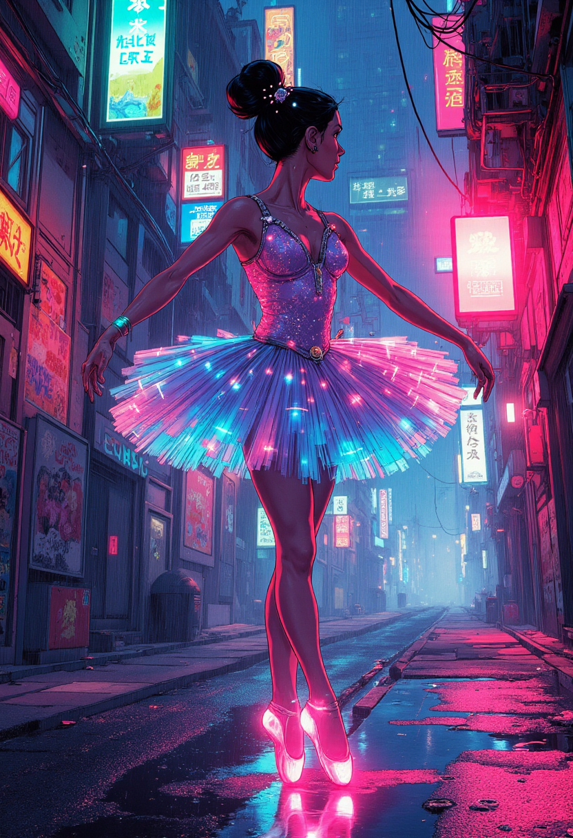 A captivating, enchantingly beautiful ballerina performing a delicate pirouette in a neon-lit alley, styled in a vivid cyberpunk aesthetic. The ballerina wears an iridescent, futuristic tutu with holographic accents, her movements radiating grace and elegance. Her hair is tied in a sleek bun, adorned with glowing LED pins, and her pointe shoes emit soft neon light with each step. The alley is narrow, framed by towering buildings with flickering holographic advertisements and graffiti glowing under ultraviolet light. The atmosphere is filled with mist from steam vents, diffusing the electric hues of pink, blue, and purple, creating an ethereal glow. The ground is wet, reflecting the kaleidoscope of neon lights, adding depth and vibrancy. The mood is otherworldly and mesmerizing, with a dynamic interplay of movement and the futuristic cityscape. Shot with a cinematic wide-angle lens, shallow depth of field, focusing on the ballerina's serene expression, with bokeh effects amplifying the magical ambiance. The color palette is rich with electric shades and contrasting shadows, evoking a sense of mystery and artistry. Tiny rain droplets glimmer in the neon glow, adding texture to the scene. ff-comic <lora:Comicbook_Flux:0.7> <lora:RetroAnimeFluxV1:0.3> <lora:Hand v2:1> <lora:FluxDFaeTasticDetails:0.4>