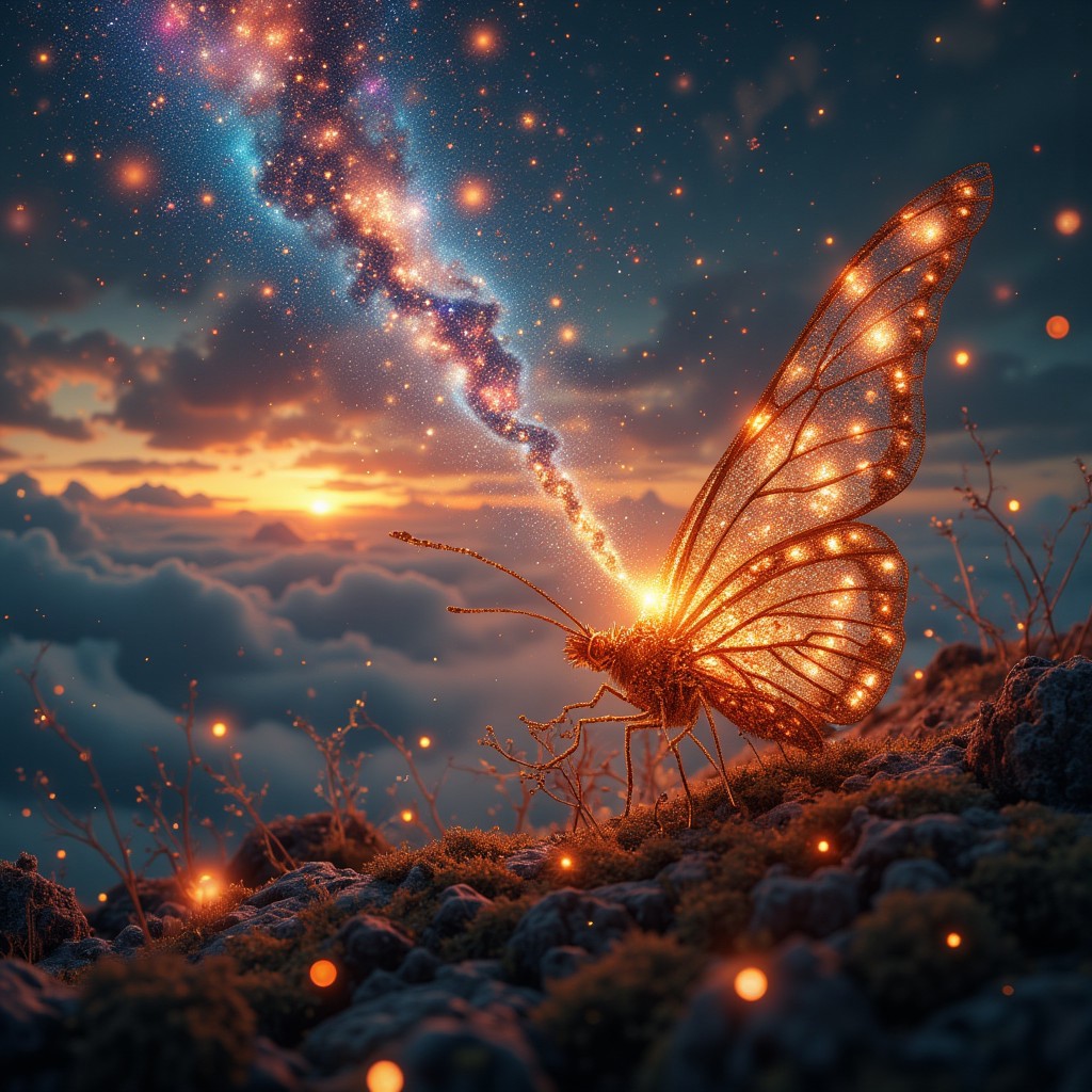 A captivating scene unfolds in a hyper-realistic animation studio, where time seems to pause for a masterpiece. In the center of the frame, a swirling vortex of colors dances, each pixel forming a mesmerizing aurora within the depth of a perfectly composed composition. The foreground is alive with the intricate details of a mechanical butterfly, its wings unfolding like a delicate clockwork marvel, every gear and ripple evident under the microscope. The background Transformed to an opulent starry night, dusting the canvas with tiny, ethereal glowing particles that appear to be suspended just beyond the focal plane. A sweeping galaxy adds depth and dimension, its lightyears mapped out in decipherable patterns. HDR highlights emphasize the dynamic contrast between the bright, shimmering stars and the velvety darkness of the universe. The extreme dynamic range captures the essence of twilight, with rays of warm sunlight peeping through the clouds like threads of gold, casting long, soft shadows that blend seamlessly into the hyper-realistic ground plane. The composition creates a sense of balance and harmony, a fusion of nature and technology, as if reality and illusion are seamless twins in this captivating spectacle.