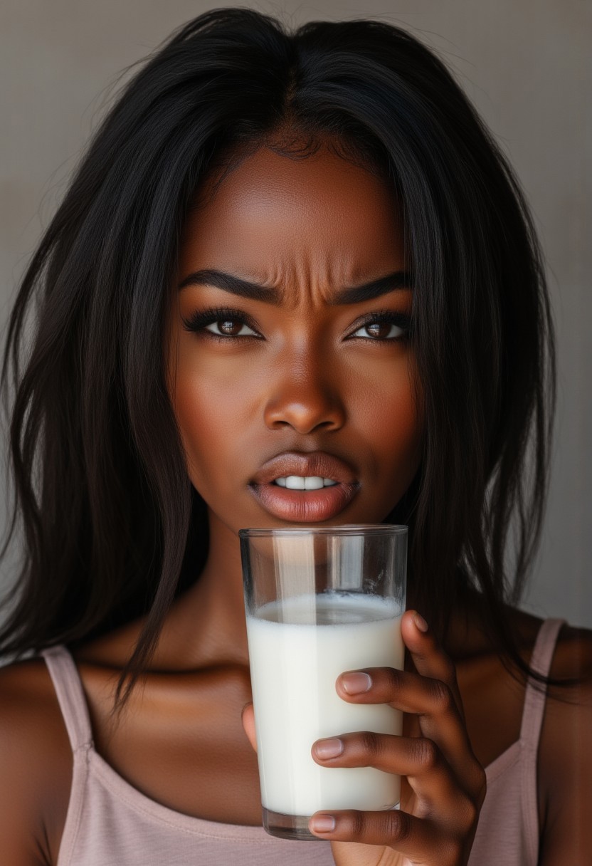 black girl FictionalAbby, drinking a glass is milk. Naughty smirk, horny face