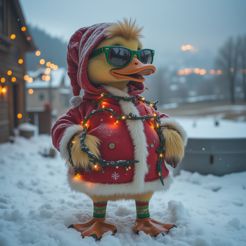 a realistic image of a duck wearing a costume with xmas theme and colorful socks, the clothing has small accessories similar to Christmas garland lights, with intricate details in the fabric, accessories in the body and sunglasses reflecting the snow. the duck is looking at distance and a little amount of snow is accumulated in his face and body, the location is a snowing farm at morning, snow is falling and a frozen water tub is in the background, a city light shines in the distance. a dense amount of fog is floating at the scene with light particles.