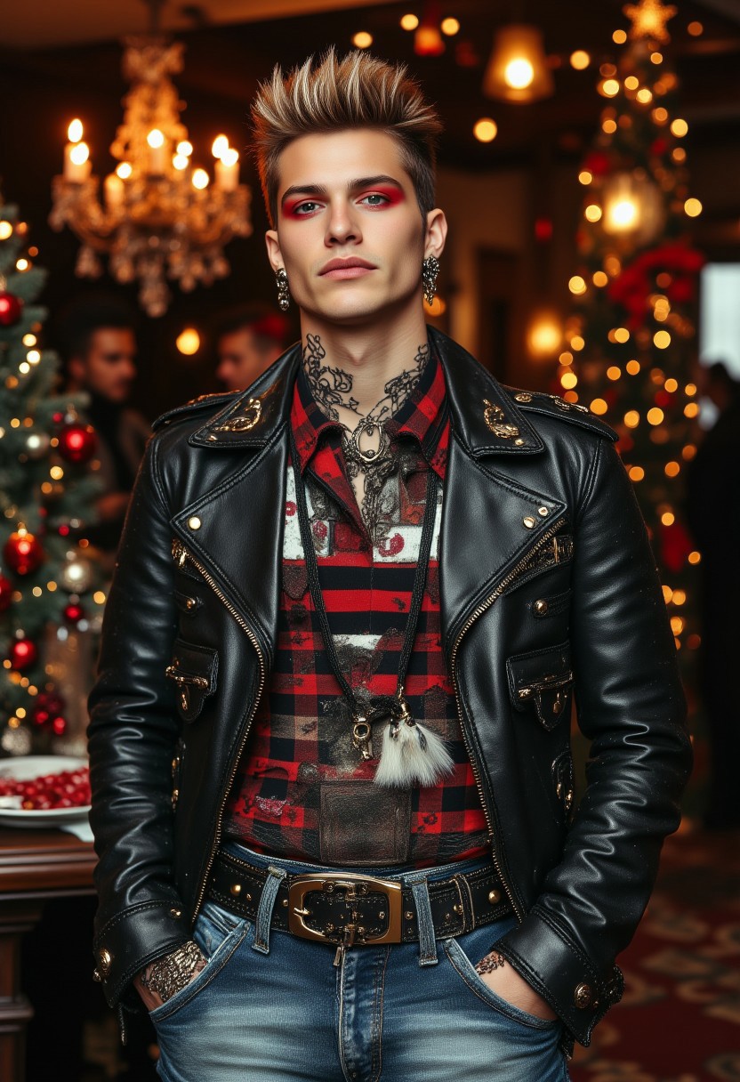 A male with a spike hair and red green eye shadow is wearing a punk-inspired look featuring a leather jacket, layered over a pinstriped bodysuit and paired with distressed denim jeans. He seems amused at a business chic christmas party, dreamstar
