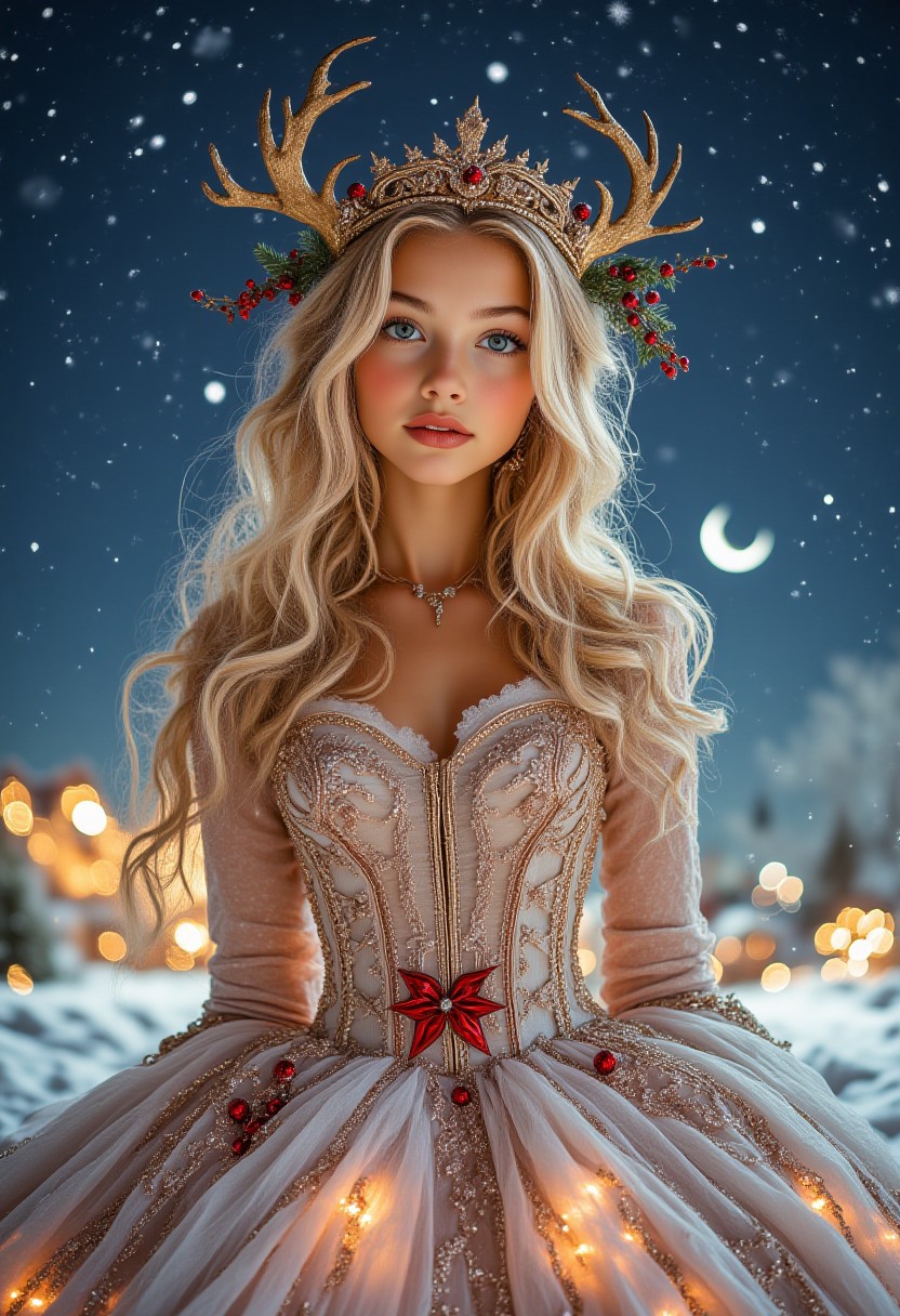 medium shot, of a beautiful girl, wearing an intricate princess dress, christmas princess, blonde long hair, digital art style, christmas ornaments, starry winter night background