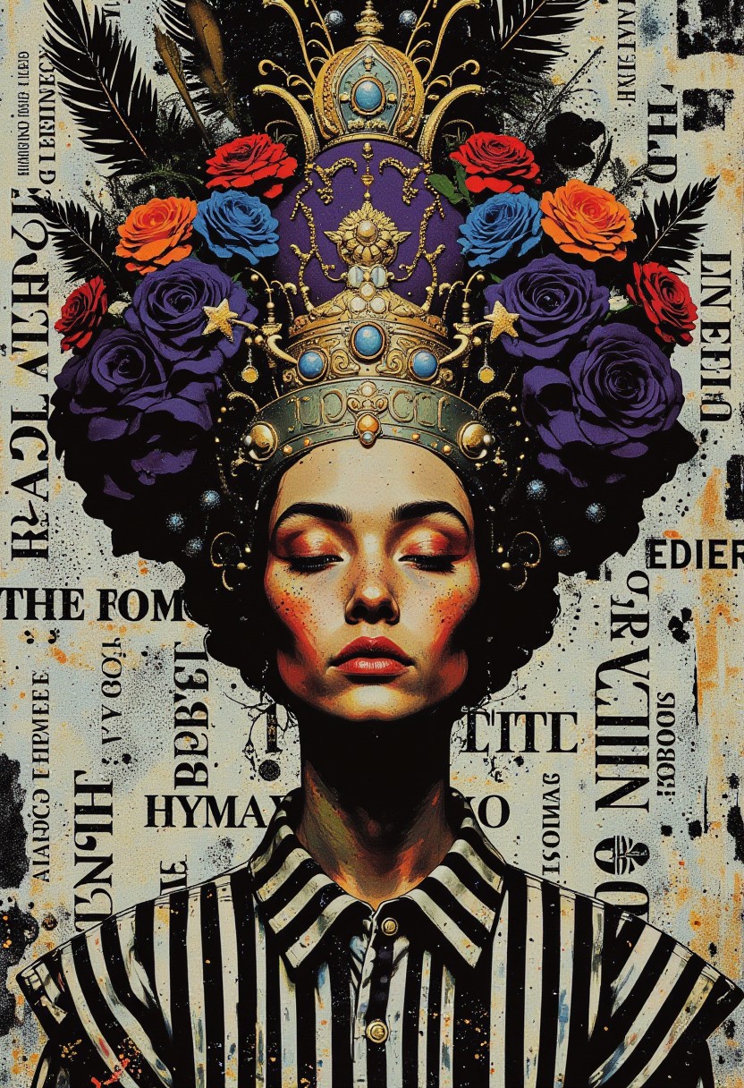 A digital collage combines digital abstract artwork, photography, and typography, centering on a close-up of a serene face framed by the head and shoulders. The individual, with light skin and closed eyes, wears a black and white striped shirt, exuding calm against the vibrant backdrop. The background is a dynamic tapestry of overlapping, randomly arranged words in various fonts and colors, predominantly black and white, interspersed with bold splashes of color, creating a textured, visually dense effect. Crowning the person's head is an elaborate, multi-layered headdress, rich with texture and opulence. It features intricate layers adorned with flowers, sparkling jewels, and delicate feathers, rendered in luxurious hues of deep blue, regal purple, and shimmering gold, adding depth and grandeur. The headdress and face seamlessly integrate with the background, the typography and imagery interwoven to craft a visually striking and cohesive composition. Blending elements of pop art and collage, the piece exudes a modern, avant-garde aesthetic that captures attention with its bold contrasts and intricate details.