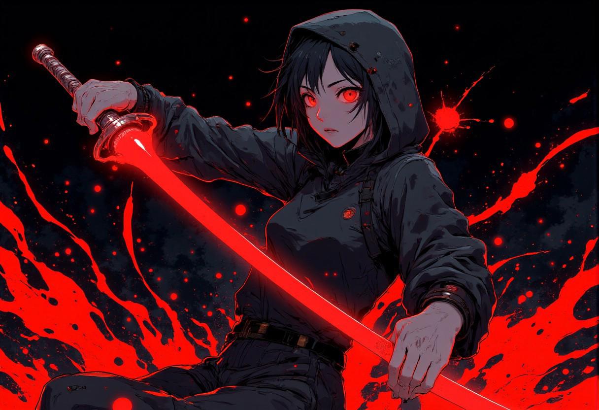A dynamic and intense anime-style fight illustration featuring a determined woman wielding a glowing red sword. The woman has striking yellow eyes that emit a fierce and focused expression, contrasting against their black monk robes. Abstract splashes of blue and red energy swirl around, creating a sense of motion and raw power. The overall composition is dramatic, with sharp, angular lines and bold contrasts between the dark background and the vivid red and blue fire. The style is inspired by high-energy action scenes in manga or anime, with an emphasis on minimalistic colors and a high-impact, modern aesthetic. The atmosphere is dark, fantastic, and filled with a sense of impending action. <lora:Let_It_Blaze_in_Crimson:1>