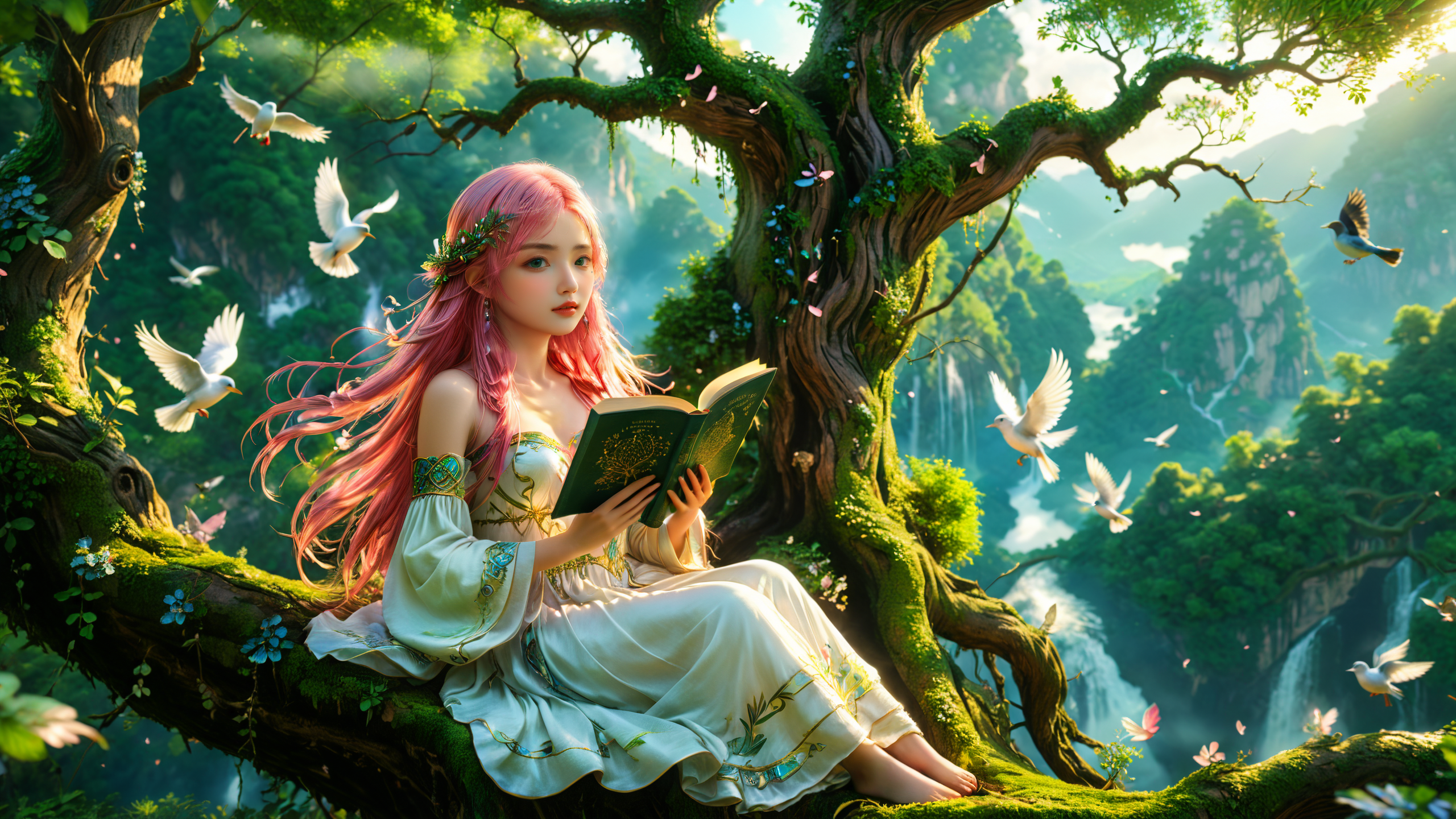 fantasy style,feet,<lora:yuukananri-base-02-XL:0.7>,yuukananri,1girl with long pink hair,long straight hair,green eyes,sitting gracefully on the canopy of a massive,ancient tree,her attention fully focused on the book in her hands,the tree's twisted and moss-covered branches adorned with faintly glowing orbs,lively birds with jewel-like,iridescent feathers joyfully singing around her,the girl's outfit exquisitely designed in an elven style,emitting a soft,magical glow,the expansive background revealing a dreamy landscape with distant floating islands and an enchanting forest,the scene bathed in soft ambient light,creating an ethereal and whimsical atmosphere,highly detailed,intricate textures,dynamic composition,fantastical elements,rich colors,enchanting mood,(masterpiece:2),best quality,ultra highres,original,extremely detailed,perfect lighting,Cinematic Lighting,<lora:detailed_notrigger:1>,<lora:xl_more_art-full_v1:0.8>,<lora:MidjourneyV6.1:0.5>,midjourneyv6.1,