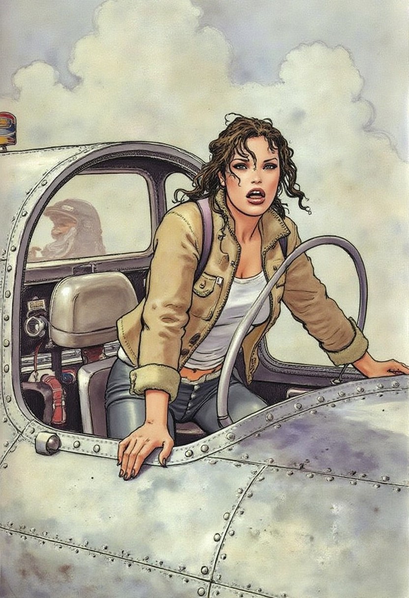itacomic1 illustration. Lara Croft wearing a fleece bomber jacket entering the cockpit of a WWII airplane with a shocked expression as she sees two empty pilot seats. The shot is from the outside of the cockpit looking in and we see a little of the metal riveted fuselage. High contrast, dynamic composition, gritty and realistic, with a cinematic feel.