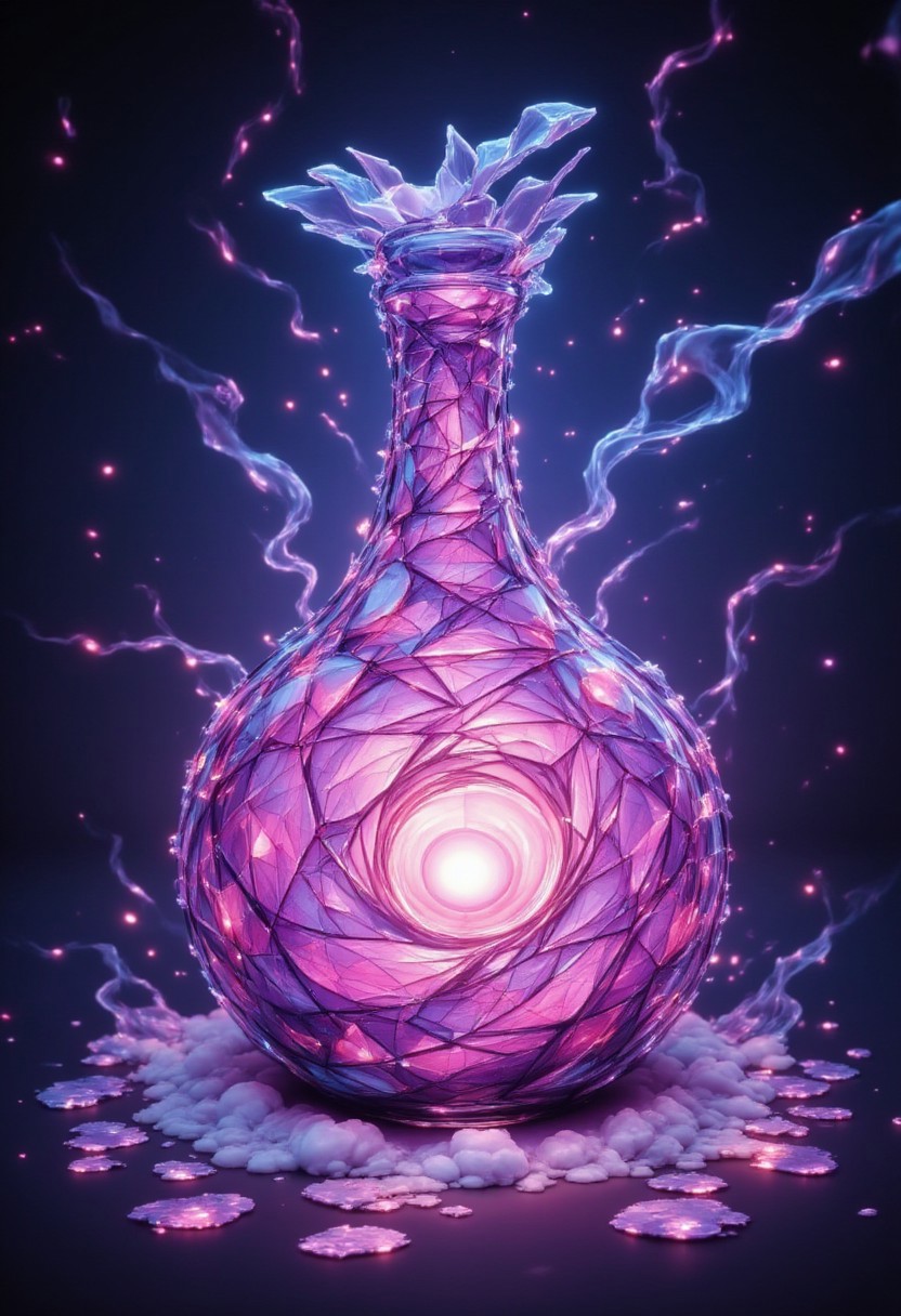 An exquisitely designed magic potion bottle, floating gracefully in mid-air, radiating vibrant pink and purple hues. The centerpiece of the bottle is its swirling, luminous liquid, glowing intensely with shifting gradients of pink, violet, and magenta, as if alive with magical energy. The glass is crystal-clear, enhancing the visibility of the dynamic liquid within, while the exterior is adorned with intricate arcane carvings, ornate metallic accents, and shimmering crystalline embellishments. Surrounding the potion are radiant embers, sparkling trails, and ethereal energy wisps that pulse and flow around it, amplifying its otherworldly presence. Rendered with extraordinary detail, the scene captures every texture, reflection, and magical effect, emphasizing the mesmerizing, glowing core of the potion
