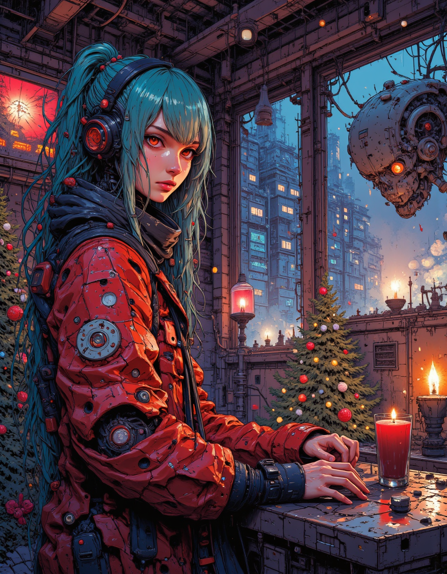 nistyle, hatsune miku as a cyberpunk cyborg girl , in a mechanical Christmas living room, anime style, looking at viewer, <lora:flux.1_lora_flyway_Epic-detail_v2:0.5> <lora:CPA:0.7> <lora:test2:0.7> , <lora:christmas living room-flux-lora:0.5>
