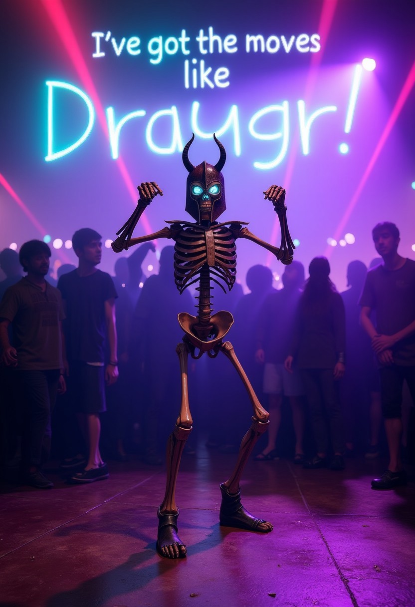 A semi-realistic Skyrim Draugr wearing a rusted horned helmet, its glowing blue eyes gleaming with undead energy, busting moves on a vibrant nightclub dance floor. The Draugr’s skeletal frame is mid-dance, arms raised and striking an awkward yet confident pose, illuminated by colorful club lights reflecting off a spinning disco ball. The background features a lively crowd of shadowy figures and neon-colored beams slicing through the foggy atmosphere. Massive, glowing multi-colored text at the top reads: 'I’ve got the moves like Draugr!' adding humor and energy to the scene