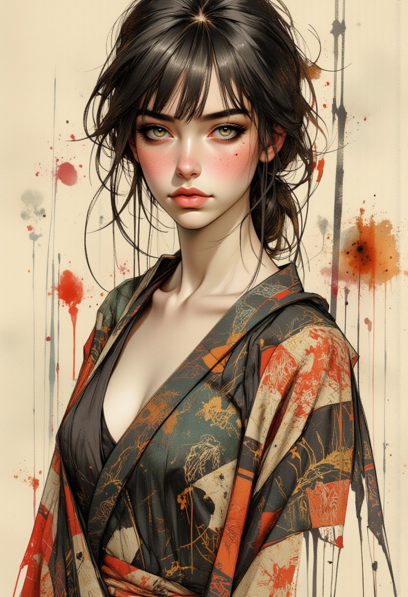 OBxiaoxiang, mythp0rt, inksketch, A traditional Japanese ink-on-paper masterpiece blending wabi-sabi aesthetics with a sensual, surreal edge. The artwork features an erotic yet stunning oriental priestess, her delicate face framed by flowing dark hair, bangs, sidelocks. Her captivating green irises glow softly, contrasting against her pale skin, as she gazes seductively at the viewer. Sepia and carmine ink flow harmoniously, She is wearing traditional kimono that slips from her shoulders, revealing deep cleavage. Abstract swirls of henna-hued patterns flow around her form, creating a sense of ethereal movement. Vibrant splashes of surreal colors—a muted crimson, soft gold, and smoky charcoal—enhance the ink composition, giving it life while embracing the imperfections and fluidity of wabi-sabi. The priestess embodies a mystical yet erotic presence, seamlessly merging traditional Japanese beauty with surreal allure