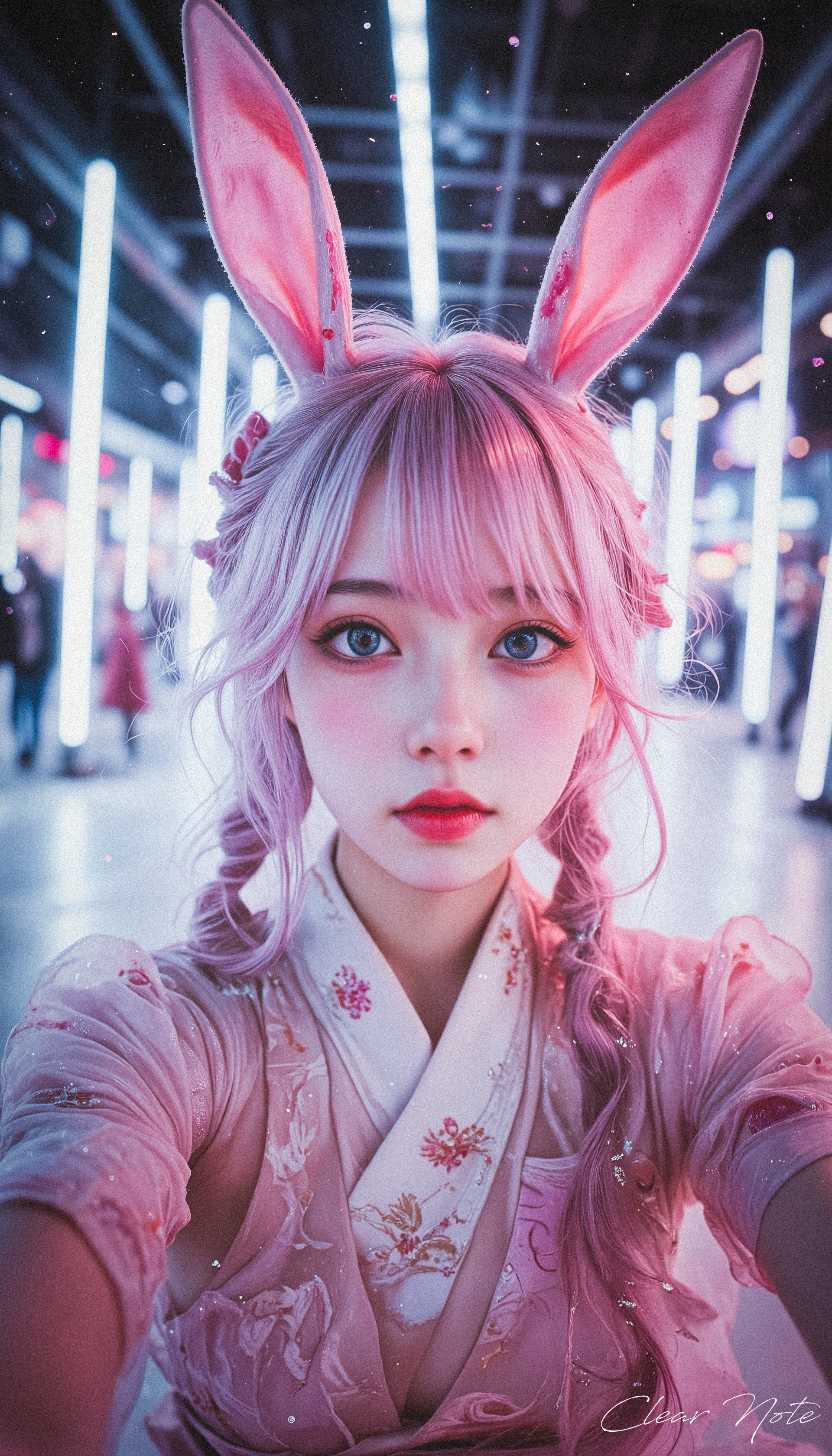 Neo Photorealistic Art Style, A Japanese girl with long rabbit ears and gradient white-pink hair wears a floral white furisode. She embodies Neo-Japan futurism, surrounded by a surreal, intricate futuristic background.
