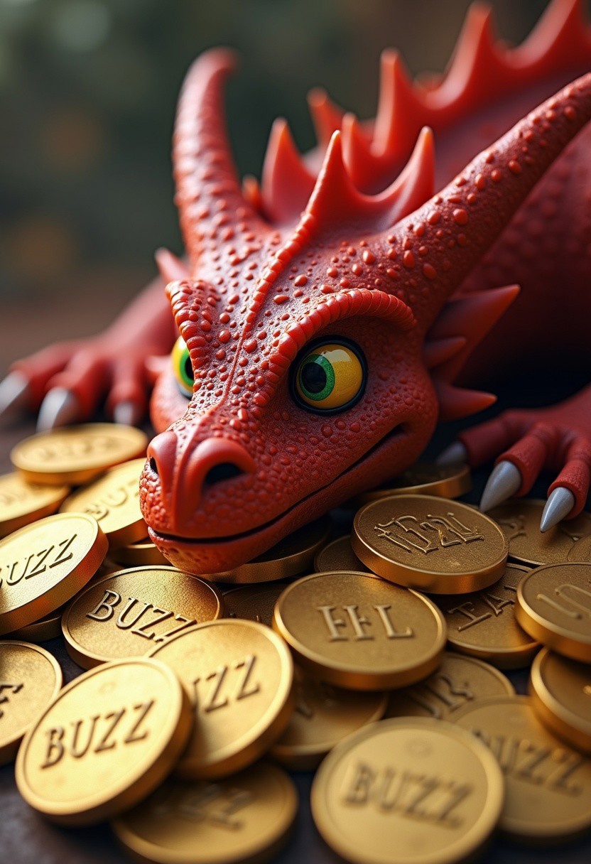 score_9, score_8_up, score_7_up, photo bokeh, blurred background A ancient and giant red dragon is resting on top of a mountainous pile of gleaming gold. Each gold coin is labeled “BUZZ”. The dragon has one eye open watching the viewer intently. There is a caption at the bottom of the picture that says “Have you brought me more BUZZ?”