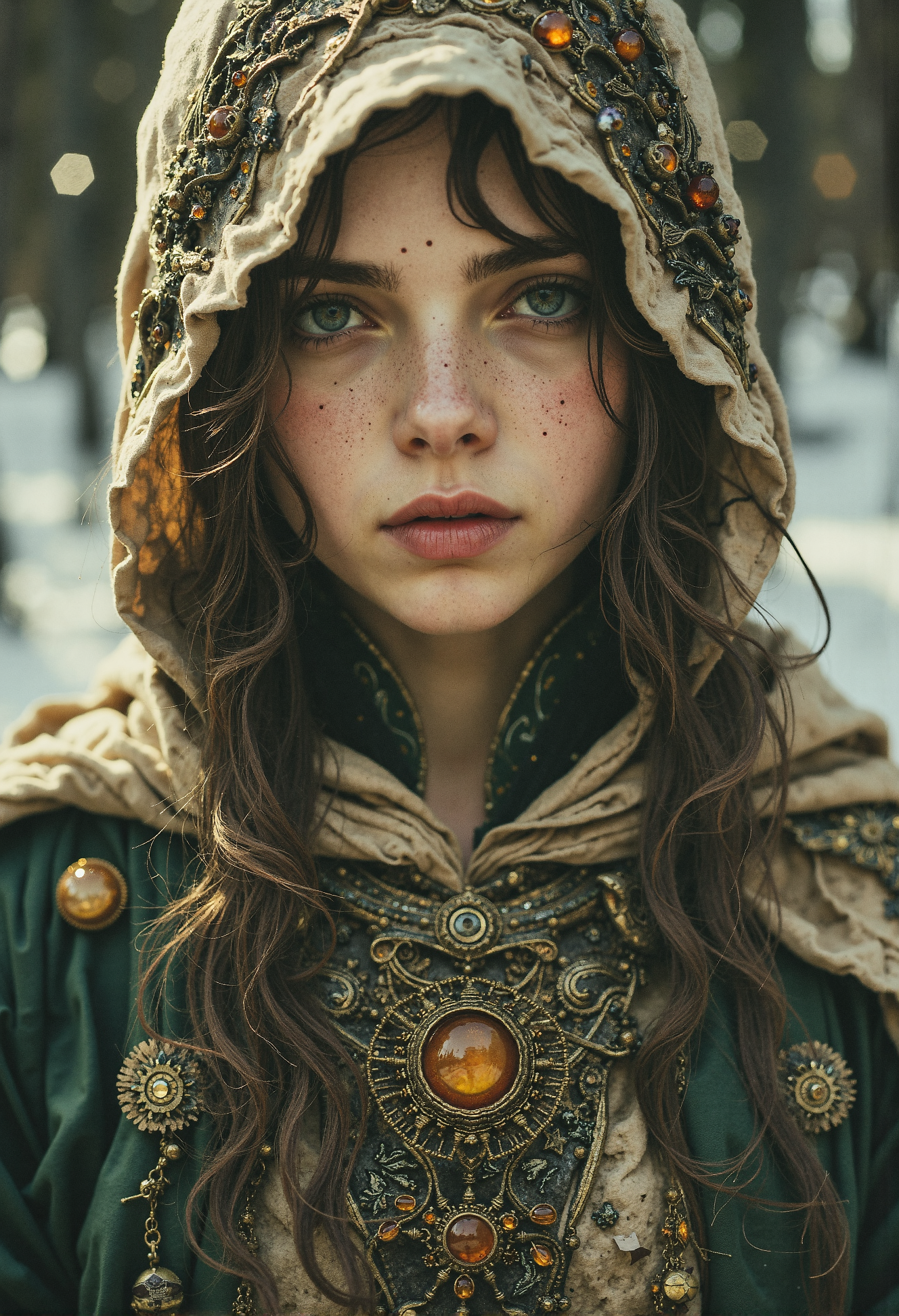 A mystical forest druidess, Extreme Upper Body Closeup Portrait, Vibrant amber and earthy green color graded. Her face, framed by a loosely draped linen hood, is illuminated by soft, diffused light that highlights her delicate features. Freckles dot her youthful yet weathered skin, telling stories of her bond with the wilds, while a subtle, satisfied smile graces her lips, exuding confidence and calm. Her piercing eyes, shaded slightly by the oversized hood, shimmer with an earthy warmth that draws you in. Strands of unkempt auburn hair peek from beneath the hood, blending seamlessly with her natural surroundings. The intricate details of her attire feature a chest piece adorned with organic patterns resembling vines and leaves, crafted from translucent amber and dark green materials. The snowy, shadowy forest backdrop contrasts beautifully with the druidessâs radiant and enchanting presence. <lora:Elden_Ring_-_Yoshitaka_Amano.safetensors:1.0>, <lora:aiai-Glimra-Flux-Dev-v2.safetensors:0.5>, <lora:Movie_Portrait.safetensors:0.8>, <lora:- Flux1 - soothing_atmo_V2.0.safetensors:0.4>, <lora:lith_mimosa_kiel_grw134_FLUX.safetensors:0.7>, <lora:Instant camera portrait photography V2.0.safetensors:0.5>,