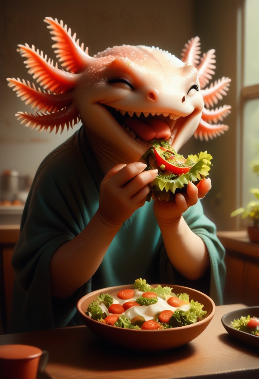 score_9, score_8_up, score_7_up, source_furry, 1other, solo, BREAK Axolotl, eating salad, laughing