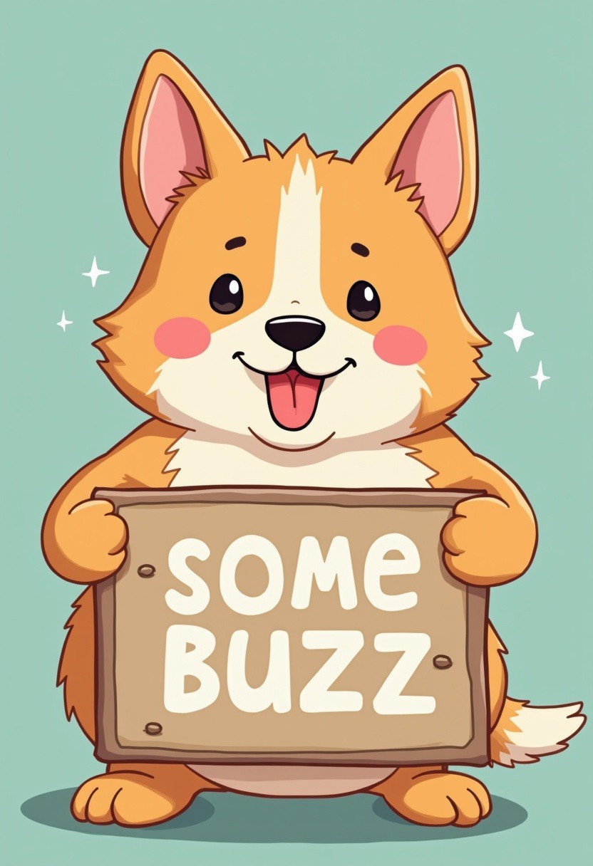 very cute dog holding a sign " some buzz ", anime style