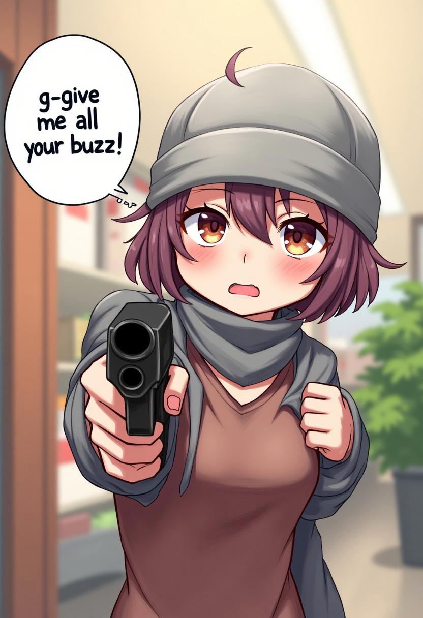 aidmatextimprover, kawaii anime style, an angry yet shy girl wearing a sock on her head as a mask or even balaclava, she's a robber and is in the market, she points a gun at the viewer, speech bubble with text: "g-give me all your buzz!"