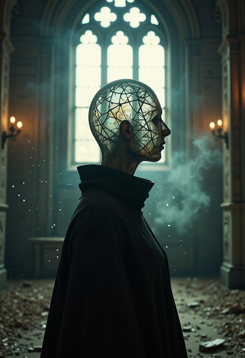 Photo in the style of ck-ncr, a cinematic close-up of a faceless goddess in a crumbling, gothic cathedral suspended in twilight. Her high-collared cloak is draped with ethereal, smoke-like tendrils that seem to defy gravity, fading into the dim light. The translucent shell of her head houses a network of delicate stained glass fragments, refracting hauntingly beautiful patterns of light and shadow onto the ancient stone walls. A faint choir of disembodied voices seems to emanate from her core, adding an auditory layer to the solemn, spiritual ambiance. Dust particles float in the shafts of light piercing through the shattered windows, framing her as a forgotten deity of endless knowledge and sorrow.