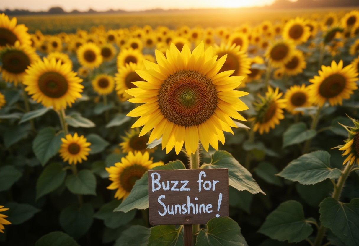 A high-resolution, aerial photograph of a vast field of sunflowers in full bloom, their golden heads all turned towards the rising sun. A single, perfectly formed sunflower in the foreground is slightly larger and more detailed than the rest. beneath the sunflower, is a hand-painted sign, reading "Buzz for Sunshine!". The overall scene is bathed in the warm, golden light of the sunrise, creating a sense of optimism and vitality. Ultra-high definition, wide-angle perspective, and a focus on the vibrant colors and intricate details of the sunflowers.